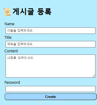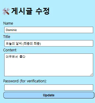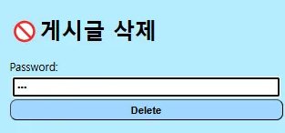 기존 친구 목록 삭제에서는 데이터가 바로 삭제되었다면 게시판의 삭제는 비밀번호로 유효성 검증을 한 후 삭제하도록 구현