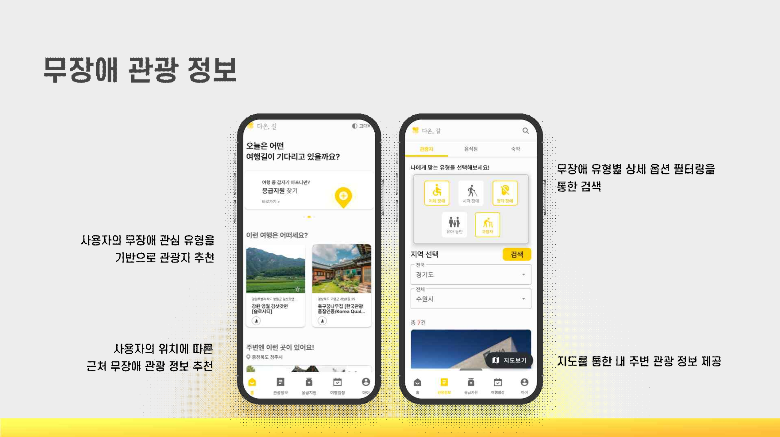 사용자의 위치에 따라 근처 무장애 관광 정보를 추천 받을 수 있어요.