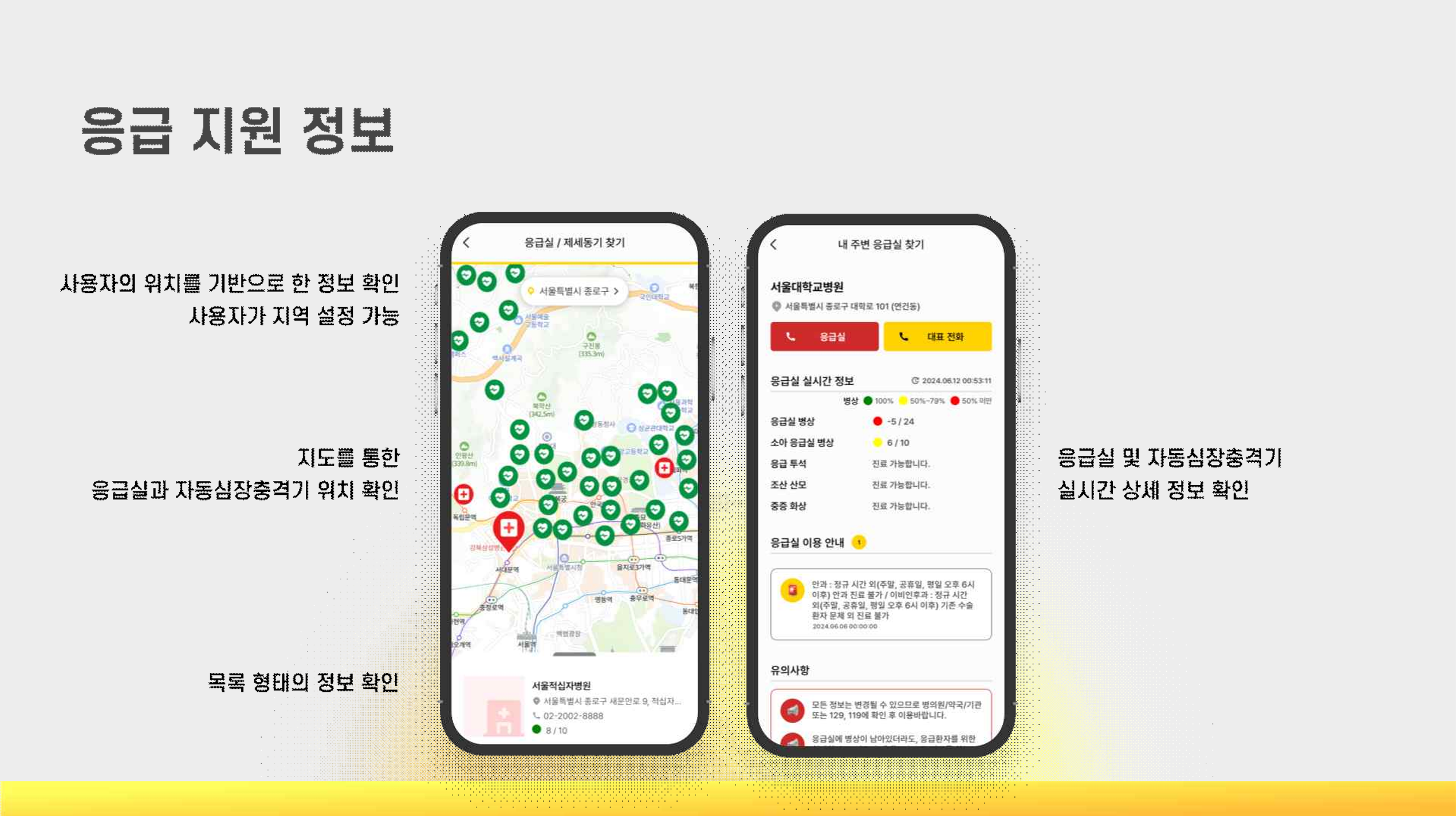 지도에 표시된 응급실과 자동심장충격기(AED)의 위치를 확인 할 수 있어요.