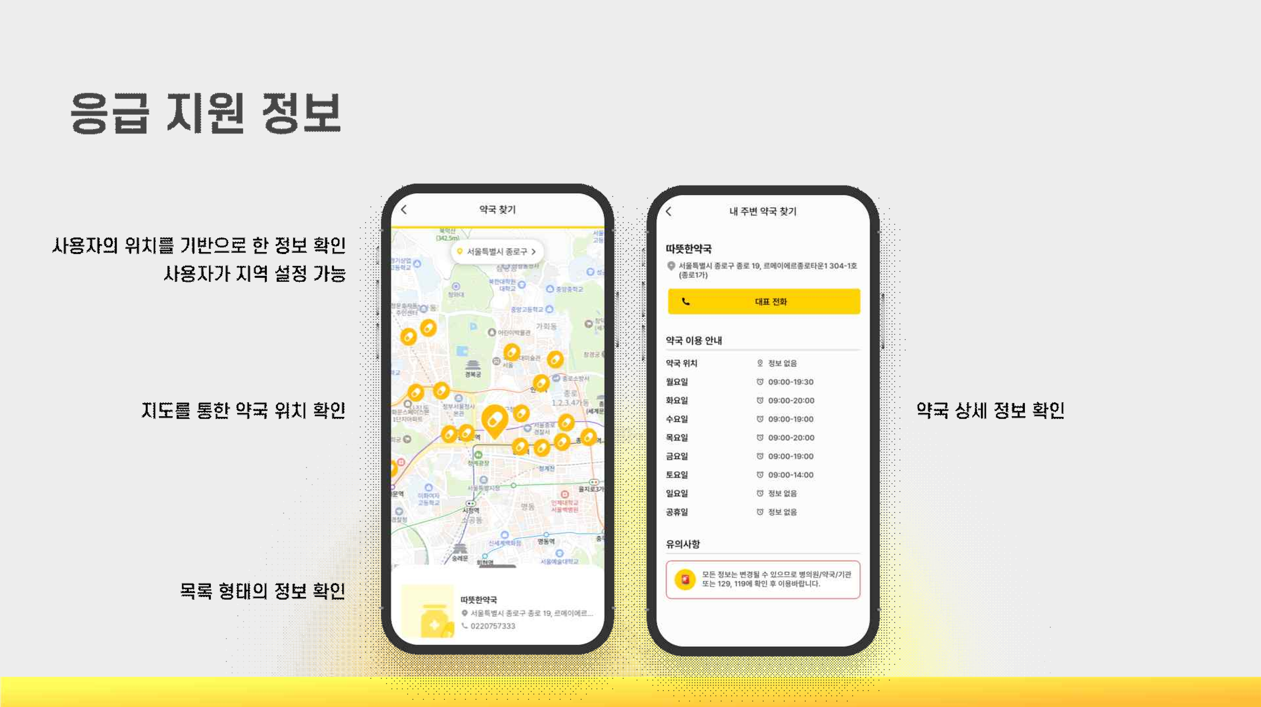사용자의 위치를 기반으로 내 주변에 있는 약국의 정보를 확인할 수 있어요.